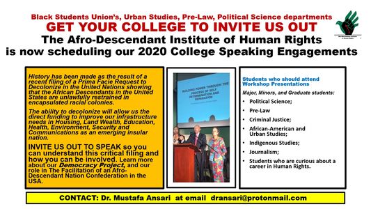 INVITE US OUT TO SPEAK so you can understand this critical filing (Request to the Decolonization Committee) and how you can be involved. Learn more about our Democracy Project, and our role in The Facilitation of an Afro-Descendant Nation Confederation in the USA.